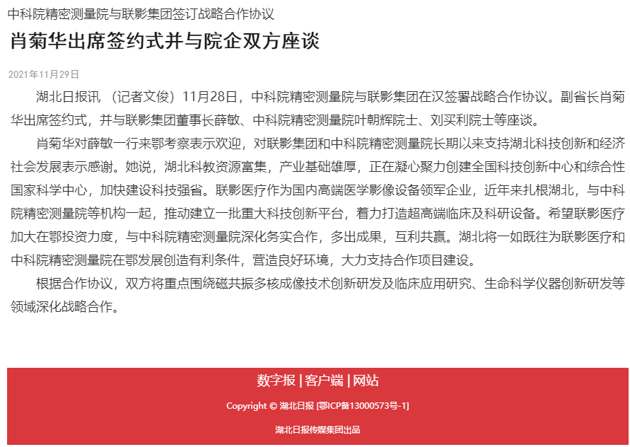 【湖北日报】中科院Ezpay与联影集团签订战略合作协议 肖菊华出席签约式并与院企双方座谈