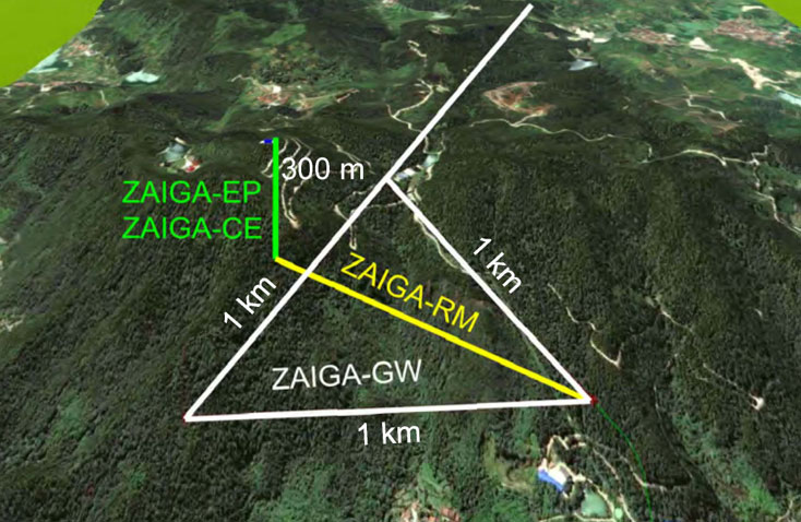 ZAIGA是以原子干涉仪为主的地下精密测量实验计划,拟选址在湖北省鄂州市的沼山建设。ZAIGA由大型原子干涉仪、高精度原子钟、高精度原子陀螺仪、激光干涉仪构成。